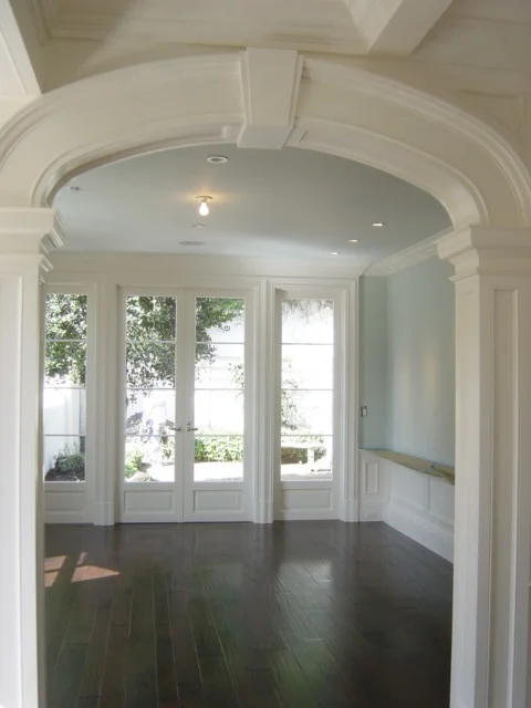 The existing entryway underwent a meticulous transformation, incorporating a new formal staircase that ascends to the existing living level. This staircase features new arched openings and decorative coffered ceilings.